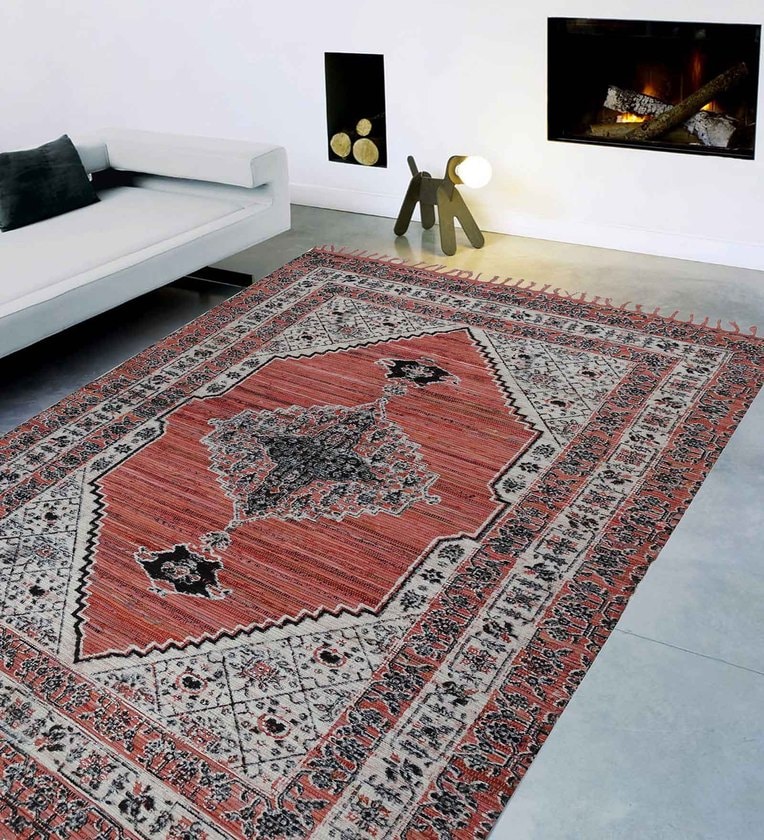 Red Cotton Screen Printed Hand Woven 8 x 5 Feet Dhurrie