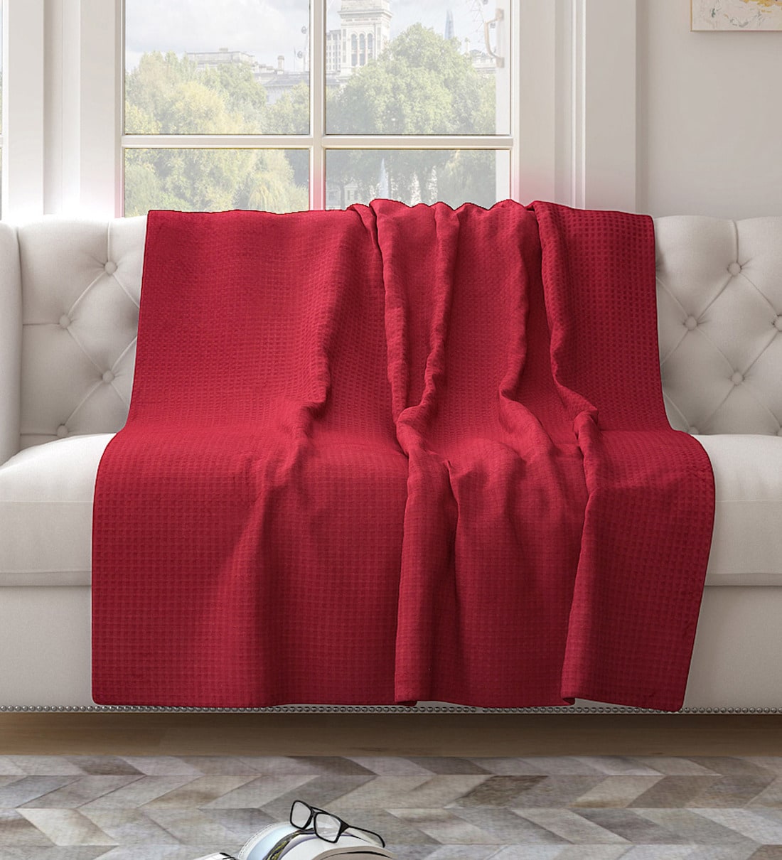 Red Cotton Solid 63X55 Inch Waffle Design Throw