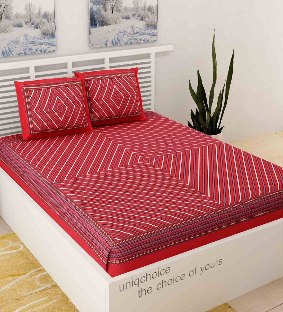 Red Geometric 120 TC 100% Cotton Queen Bedsheet With 2 Pillow Covers
