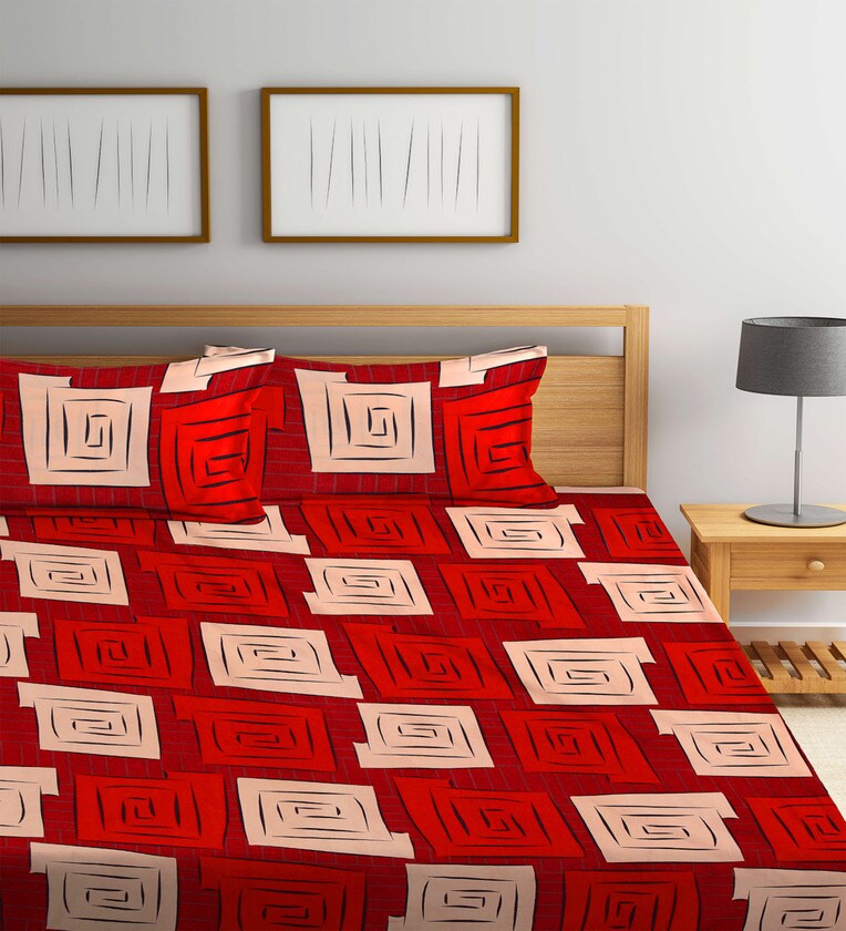 Red Geometric 300 TC Cotton Blend Double King Sized Bedsheet With 2 Pillow Covers
