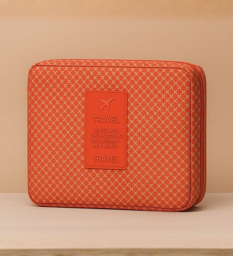 Stylish red pouch with geometric design ideal for toiletries cosmetics and travel essentials