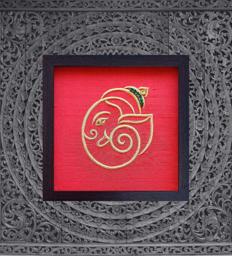 Red Handcrafted Lord Vighnaharta Gold-Plated Jardoshi Embroidery Wall Art