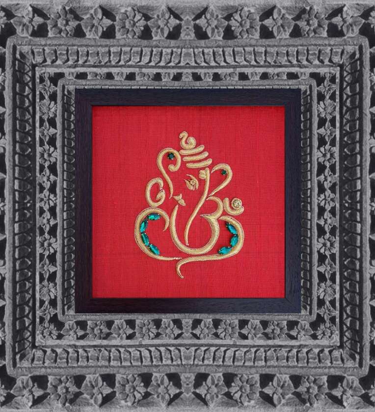 Red Handcrafted Shree-Ganesha Gold-Plated Jardoshi Embroidery Wall Art
