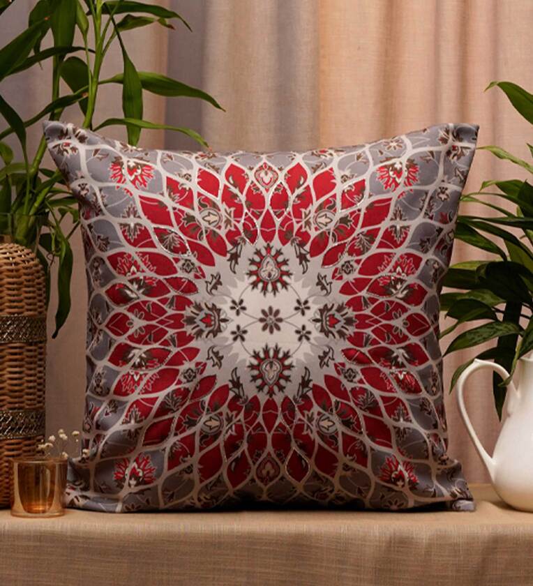 This stylish cushion cover in grey colour features a beautiful abstract floral pattern with delicate silver zari hand embroidery in contrasting shades of red and brown. Elegant and sophisticated, this cushion cover is finished with a solid backing in the same colour as the surface.