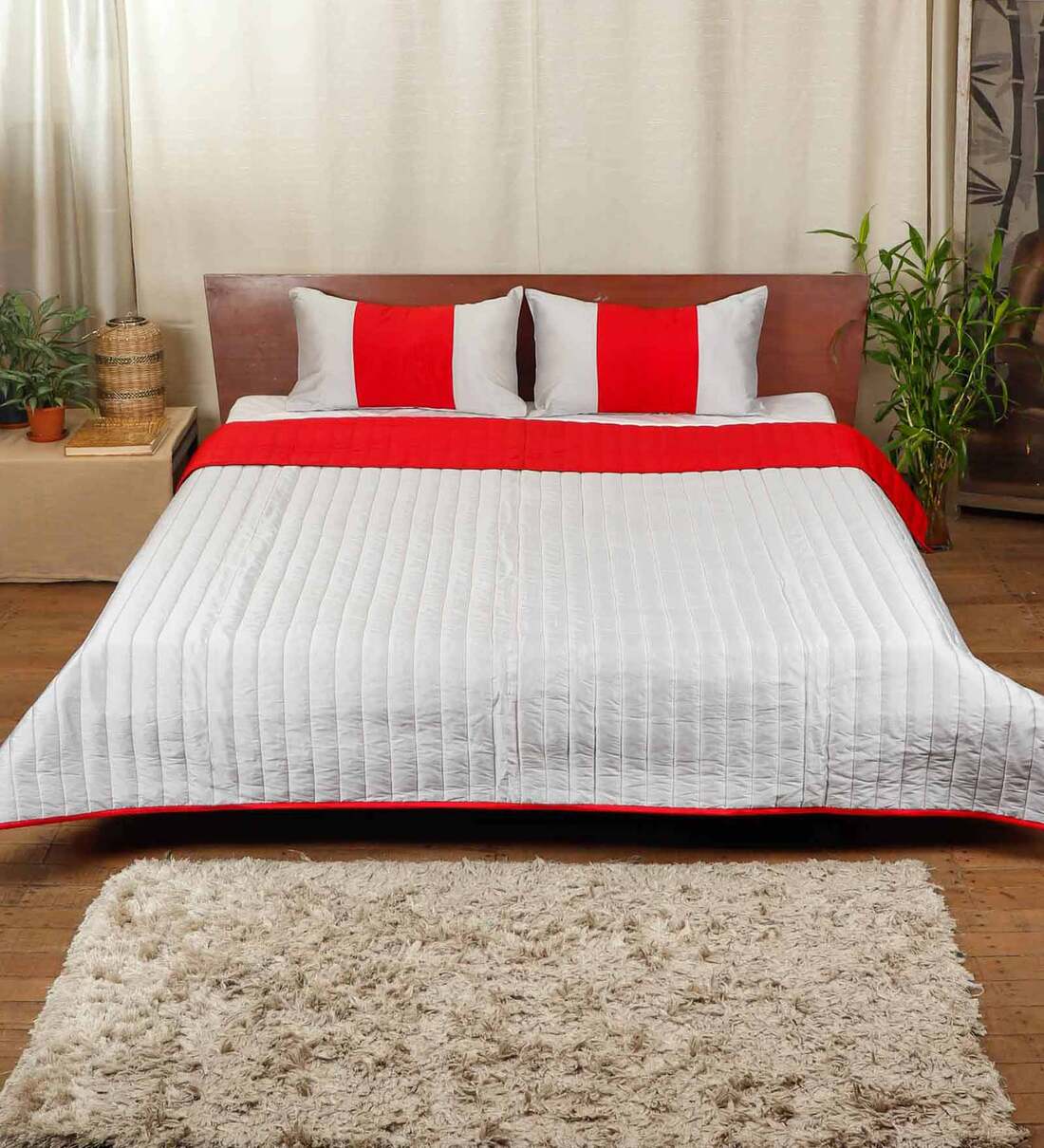 This winter season, dress your double beds with Zeba's latest reversible quilt. The soft slate-y grey fabric is detailed with bright red quilting lines- the contrast brings out the best in both the lovely shades. Being reversible, the quilt can be used on either side. The patchworked pillow shams in this decorative quilt set are beautiful too, and are guaranteed to add a pop of colour to your bedroom!
