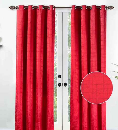 Red Polyester Solid 9 Ft Semisheer Eyelet 2 Door Curtains