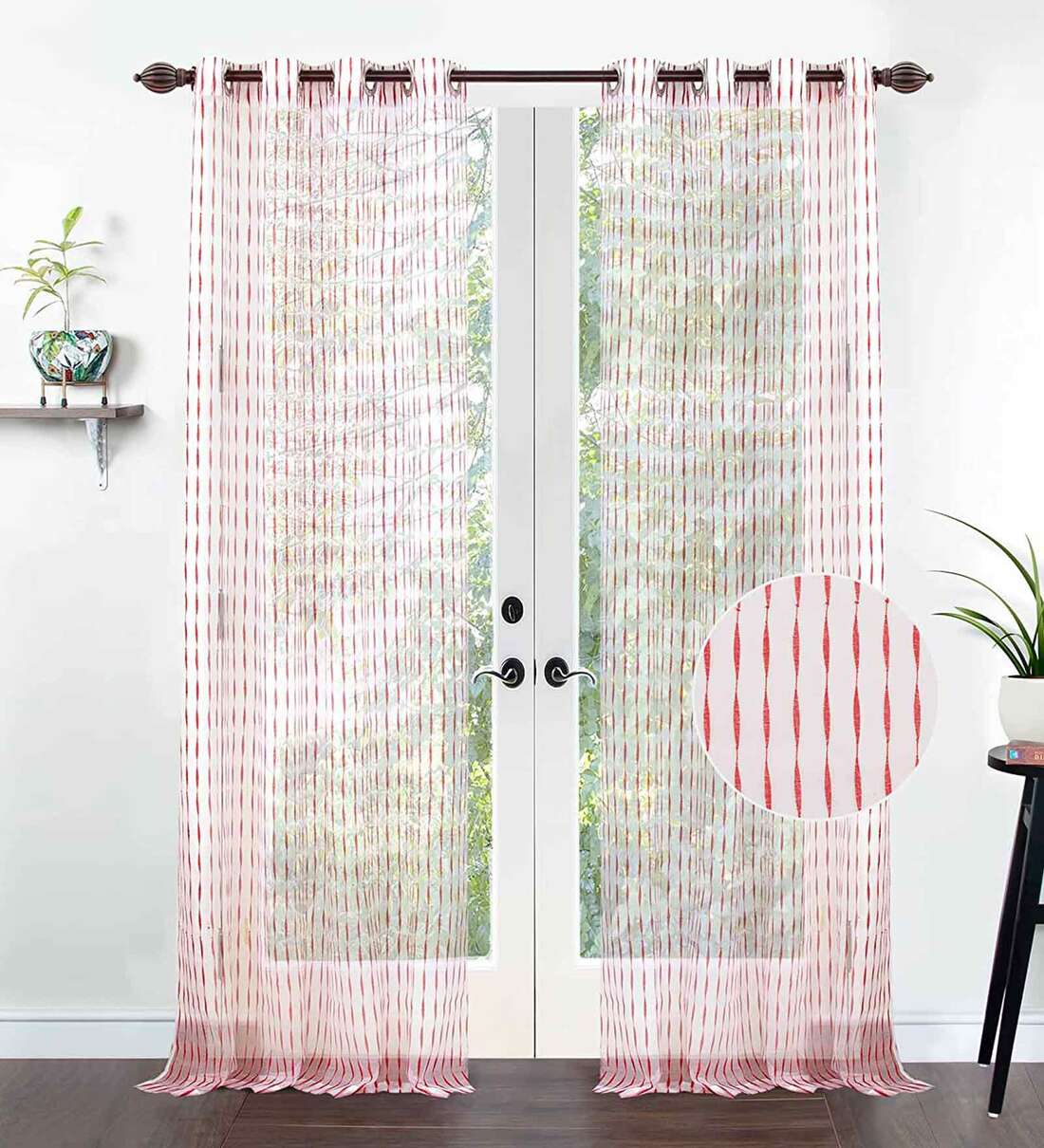 Red Polyester Striped 9 Ft Sheer Eyelet 2 Curtains