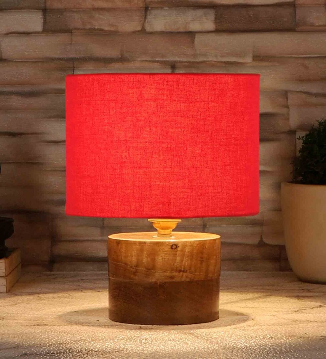 Red Shade Table Lamp With Wood Base