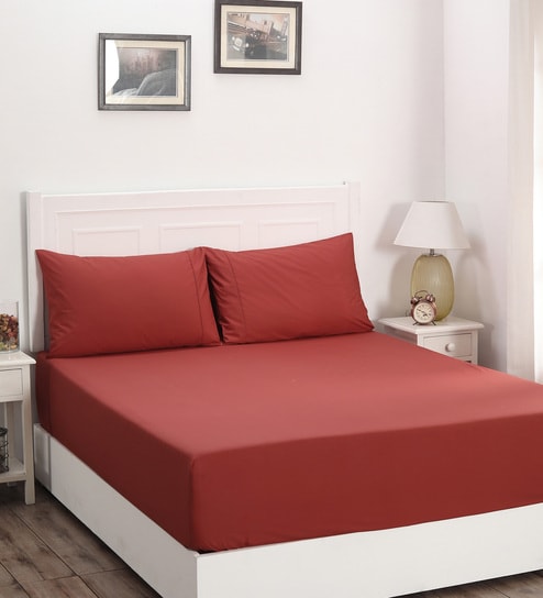 Red Solid 200 TC Cotton Queen Sized Fitted Bed Sheets with 2 Pillow Covers
