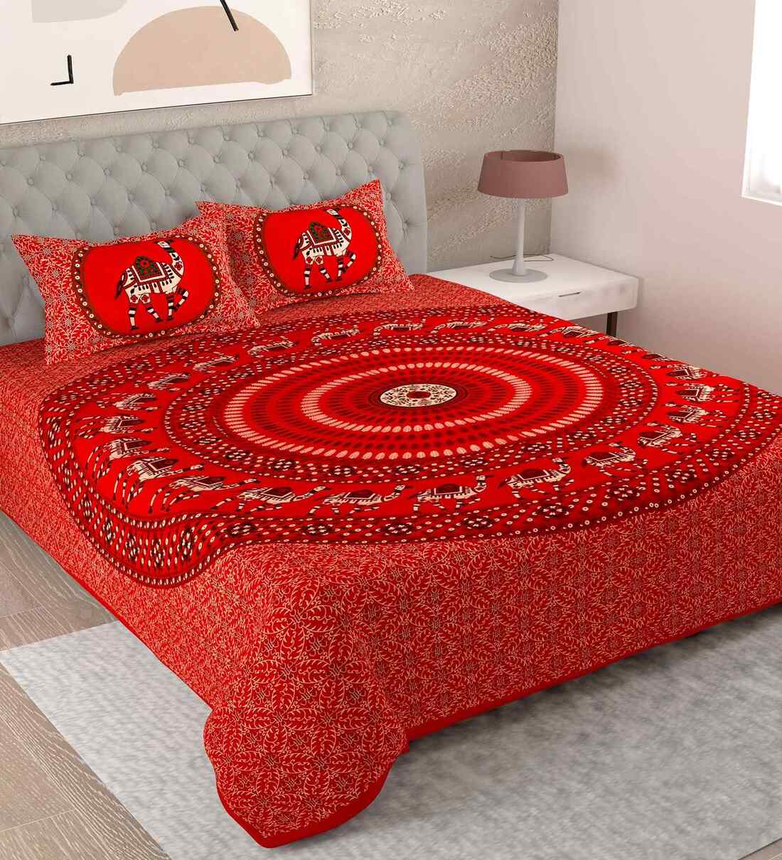 Red Traditional 180 TC Cotton King Sized Bedsheet with 2 Pillow Covers