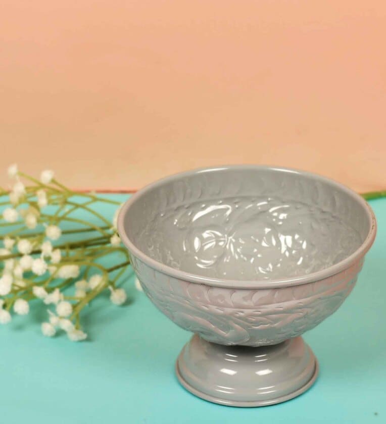 Classic yet contemporary, this Grey Aluminium bowl will be a great addition to your crockery collection. It is made from hand crafted Aluminium. You can use it to serve salad or other dishes to your guests and earn admiration for your exquisite taste.Features: Material: AluminiumFinish: GreyDimensions in inches : (L x W x H) 5.5x5.5x4 inchesSold as Single pieceCare instruction: Clean with dry cloth*Products are handcrafted; there could be slight variation in the product from the image.