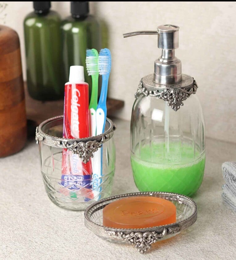 Soap tray-10x13.5x4glass- 9x9x11lotion dispenser-9x9x19