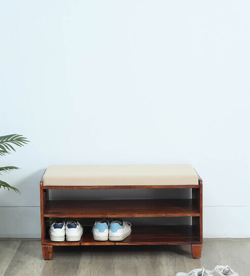 Rezzan Sheesham Wood Shoe Rack With Seating In Honey Oak Finish
