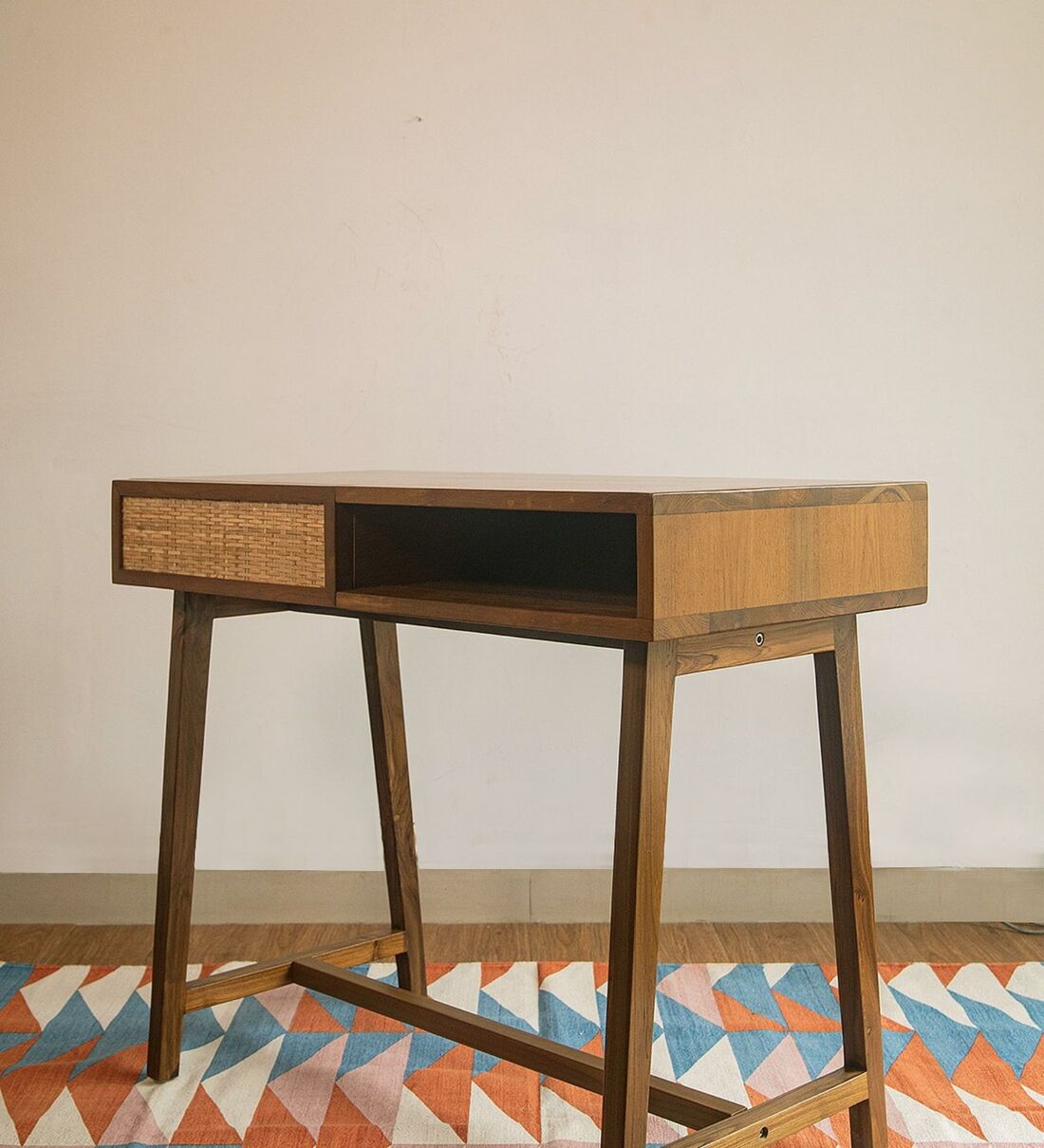 The Right Angle Study Table crafted with teak wood, is a modern study staple in a natural wood look. A utilitarian drawer with rattan details adds a tropical touch to the design. The table's angular design plus legrests complete its sleek look to work perfectly as a study desk, work desk, or a contemporary vanity