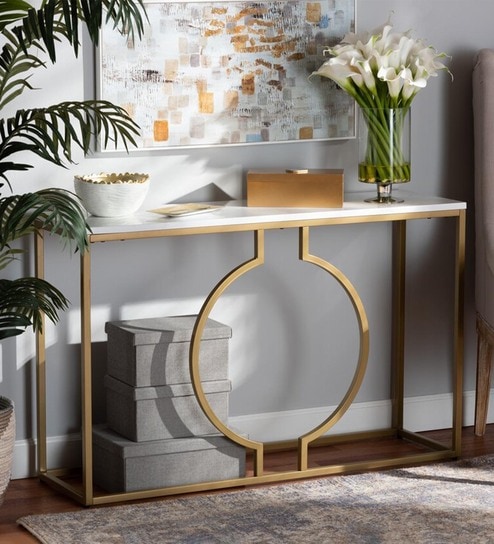 A Console Table is wide, shallow and roughly as tall as a regular table or desk which sits up against a wall. The average console table height is 30 inches, though designs can range anywhere from 28 inches to 32 inches in height.