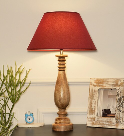 Roman Maroon Cottan Fabric Shade Night Lamp With Wood Base