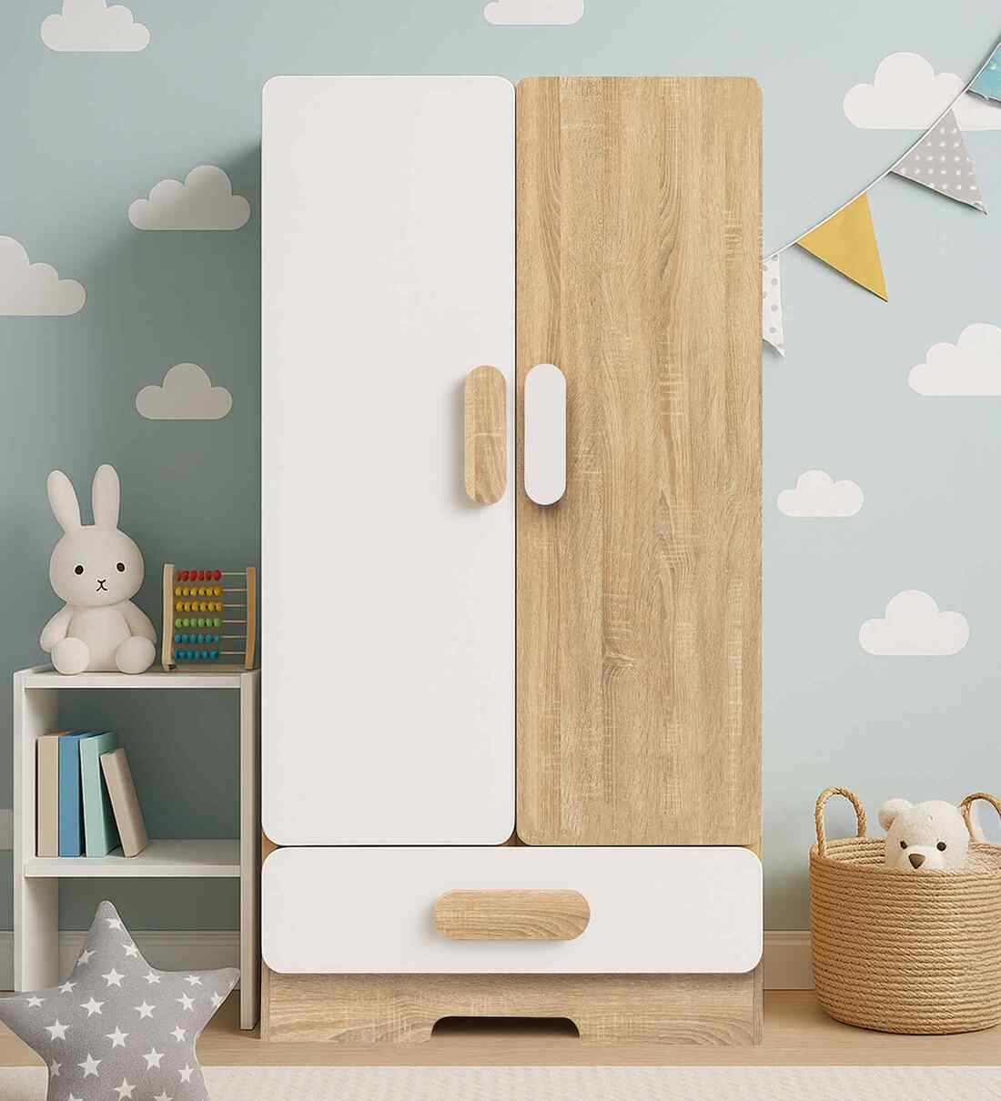 Introduce vibrant style and practical storage to your child s room with our brand-new 5-foot-tall wardrobe, thoughtfully designed for kids. Available in a delightful range of kid-friendly colours, this wardrobe brightens any space while organizing clothing effortlessly. It features a sturdy cloth hanging rod, perfect for keeping everyday outfits easily accessible, and adjustable shelves that adapt as your child grows ideal for storing everything from folded clothes and accessories to toys and books. A spacious drawer at the bottom offers additional concealed storage, while the smooth shutter doors, finished with gentle, rounded corners, ensure safety and peace of mind for parents. Whether you have a toddler or a tween, this wardrobe combines vivid modern design with functionality, inspiring tidy habits in a safe environment. Transform your kid s room with this charming, space-saving solution that s built to last and designed to delight! DIMENSIONS: Width 80cms(31.5 inches); Depth 45cms(17.7 inches) ; Height 150cms(59 inches) EXTREMELY SAFE: We know chemicals have no place in your kid's space, so we have used no paint on the product. The product's surface is a scratch-resistant PVC lamination in everlasting colours. The shutter doors feature smooth, rounded corners for added safety ideal for little ones. SOFT-CLOSE HINGES: The shutters close slowly and automatically to prevent noise and injuries caused by finger trapping. ADJUSTABLE SHELVES: Adjust the shelves to different heights to accommodate your storage needs, and combine multiple modules side by side for an expanded unit. DURABLE: Made of durable engineered wood with a scratch-resistant surface and includes plastic buffers to prevent floor scratches. WARRANTY: It comes with a 1-year warranty for any manufacturing defect. FREE INSTALLATION: We offer free assembly for this product. Please contact Alex Daisy's service support via WhatsApp at 98739-92500 to request its assembly. We are always happy to help you.