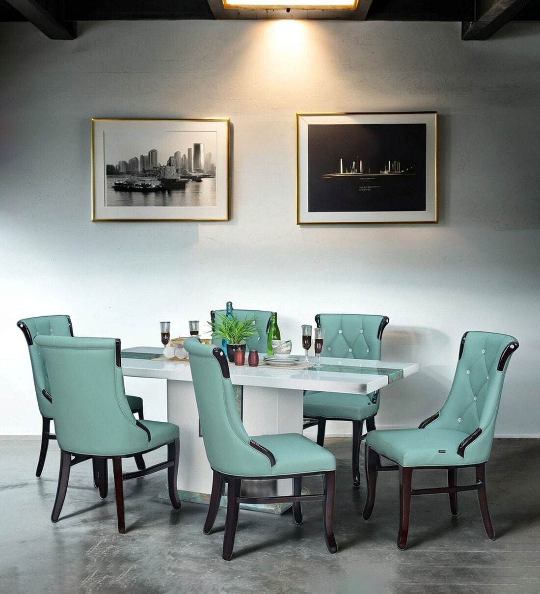 Rome Italian Marble Dining Set Six Seater a pinnacle of opulence and design that brings a touch of Italian elegance to your dining space. Immerse yourself in a world of luxury with its captivating features. The exquisite luxury PU finish adorns this dining set, adding a refined touch that exudes sophistication. The diamond tufting design, adorned with crystal buttons, not only elevates the aesthetics but also provides a sumptuous seating experience. The designer curved backrest offers ergonomic support while enhancing the set's visual allure, making every moment spent at the table a delight. Crafted with Italian art marble, this designer six seater dining set is a testament to the timeless beauty of Italian craftsmanship.