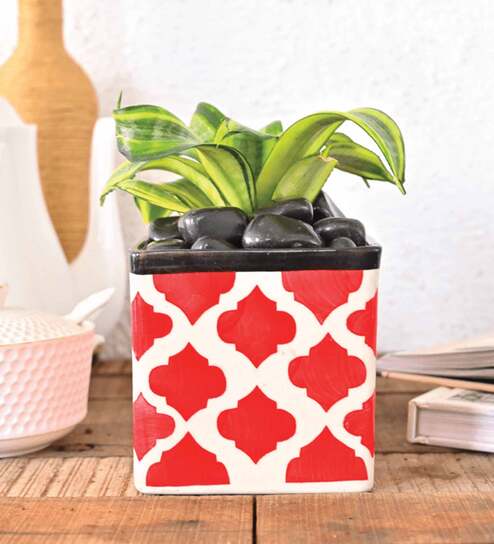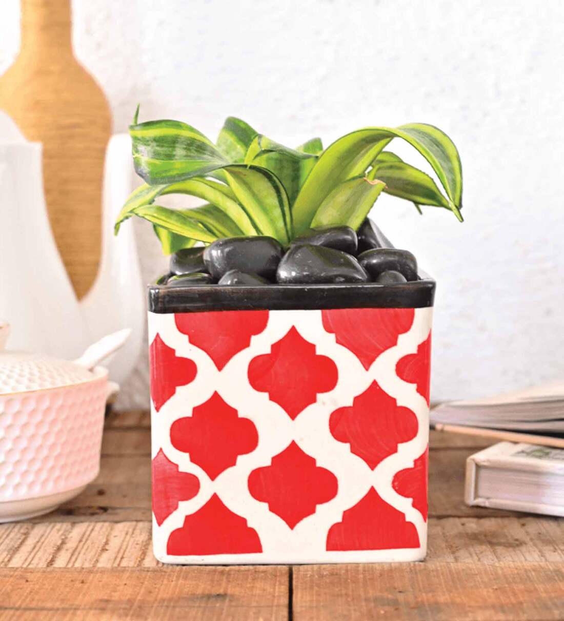 The beauty of the lot with its bright red ikat design in bautiful bright glaze. The planter is made of premium ceramic with a weighted base and has a drainage hole at the bottom to save your plant from overwatering. Its square shape makes it a perfect choice for those snug spaces while not ocmpromising on the beautiful folk vibe it adds to a space.
