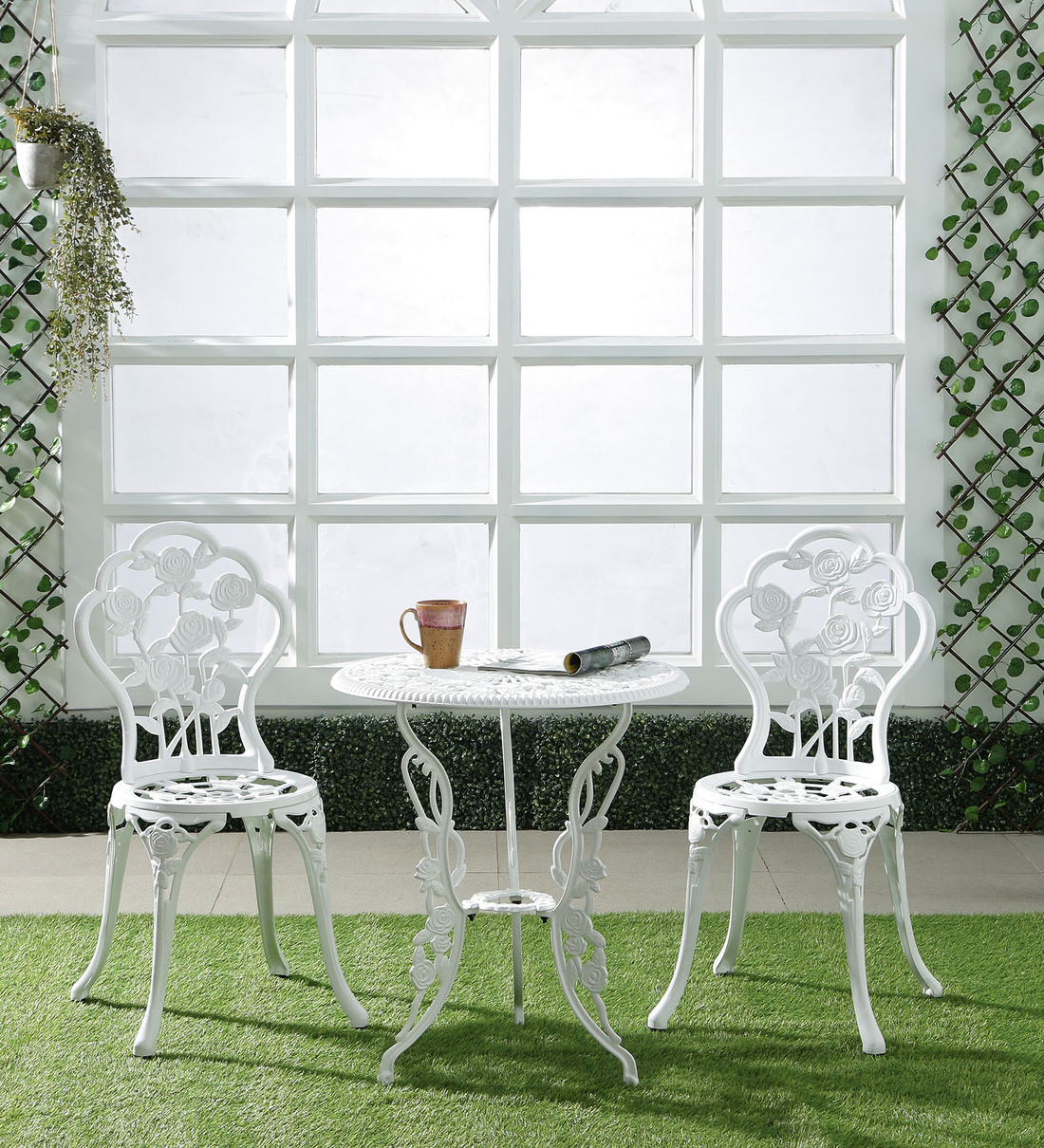 This table chair set is designed and produced with highest attention to detail and workmanship to make it an ideal addition to your home garden. It is made from Aluminium/ Iron Casting, which makes it extremely durable and weather resistant. The rose design adds charm to the overall look. The table has centre hole to fit your garden umbrella in summer and monsoon. It will make your garden space inviting to spend quality time with your friends and family. Available in White and Greenish Bronze colours. Beautiful rose flower design. Elegant design with sturdy construction. Seat and backrest made from Aluminium casting and legs made from steel casting. Powder coated for superior weather resistance.