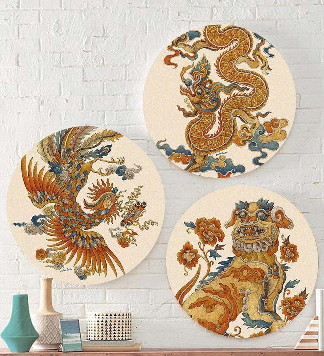 From the Chinese Folklore to Your Home! The Lucky Loong Canvas takes inspiration from Chinese mythology to bring luck and prosperity into any space! The dragons are considered to symbolize potent and auspicious powers. Would you like to ensure that your home reaps the benefits of such a print? The dragon is also considered to be a symbol of power, strength, and good luck for people who are worthy of it in East Asian culture. Lucky Loong Canvas A canvas set that includes a Lion, a sign and symbol of wisdom, power, and superiority. The Lucky Loong Canvas also has a digital art showing the Phoenix. Often paired with the dragon, they are considered to be a metaphor for the Yin and Yang philosophy. This wall art should be a great reminder to read about different cultures! ABOUT the ART Modern Art came into being owing to the technological advancements during the industrial age. Rationalist practices of the past were rejected. The idea was to experiment and come up with innovative designs. Different textures, surfaces, and other elements were used by artists to create powerful paintings and designs. The Lucky Loong Canvas is a modern amenity that should be used by everyone who wants to add a fresh look to their decor. The canvas will easily fit into your home or office. SPECIFICATIONS Dimensions: Small- 30cm, Medium- 40cm, Large- 50cm Material: Canvas Technique: Digital Printing Sold with Wooden Frame with Gold Ring frame Matte Finish FEATURES Clean design and elegant look High quality Durable Art Work Handle with Care Note: The color of the actual product may slightly vary from the images shown as the images are shot in different lighting. GIFT BOX CONTAINS The Gift Box that the Artment sends consists of Lucky Loong Canvas with a triple layering of bubble-wrap and safely packed in a box. STYLING TIPS Lucky Loong Canvas is a beautiful addition for whatever space you want to generate balance in It will go well with a subtle grey and white decor or for a bold look can be paired with darker backdrops Display the wall art on a plain wall to enhance the look of the space When paired with gold elements, the wall art shall become an eye-catching element of the decor The wall art is a perfect piece for your foyer arranged with wooden and natural accents The Lucky Loong Canvas shall change the look of your home decor or cafes and restaurants