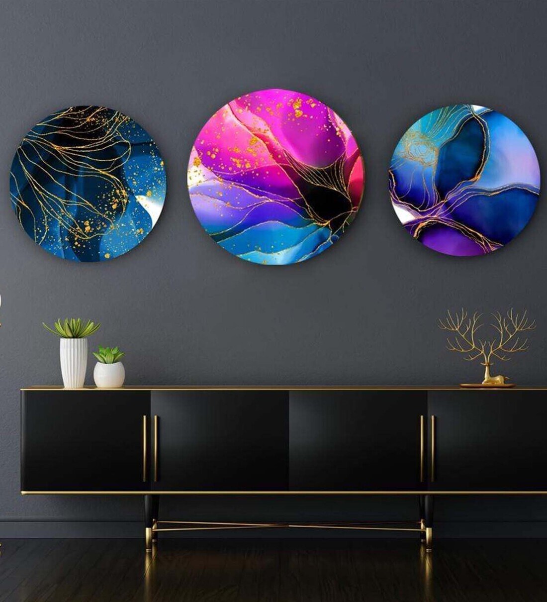 Bring Nature Home with a Pop! The Abstract Flowers in Hues of Blue Canvas is a striking set of three digitally printed canvases that will enable you to make an artistic statement. Your decor, no matter what style it has been inspired from, will work wonderfully well with this canvas set. After all, the beauty of flowers and gold cannot be compared to anything else! Abstract Flowers in Hues of Blue Canvas The look and feel of the wall art are such that you are taken to a different dimension and lead you to generate thoughts of your own. The vivid color combinations used to create these canvases are going to leave you amazed! Get your statement decor piece now! ABOUT the ART Modern Art came into being owing to the technological advancements during the industrial age. Rationalist practices of the past were rejected. The idea was to experiment and come up with innovative designs. Different textures, surfaces, and other elements were used by artists to create powerful paintings and designs. The Abstract Flowers in Hues of Blue Canvas is a modern amenity that should be used by everyone who wants to add a fresh look to their decor. The canvas will easily fit into your home or office. SPECIFICATIONS Dimensions (Dia): Small- 30cm, Medium- 40cm, Large- 50cm Material: Canvas Technique: Digital Printing Sold with Wooden Frame with Gold Ring Frame Matte Finish Sold in a Set of 3 Canvases FEATURES Clean design and elegant look High quality Durable Art Work Handle with Care Note: The color of the actual product may slightly vary from the images shown as the images are shot in different lighting. GIFT BOX CONTAINS The package that the Artment sends consists of Abstract Flowers in Hues of Blue Canvas with a triple layering of bubble-wrap and safely packed in a box. STYLING TIPS The Abstract Flowers in Hues of Blue Canvas is going to be a beautiful addition to your minimal or boho type home decor It will go well with a subtle grey and white decor or for a bold look can be paired with darker backdrops Display the wall art on a plain wall to enhance the look of the space When paired with gold elements, the wall art shall become an eye-catching element of the decor The wall art is a perfect piece for your foyer arranged with wooden and natural accents