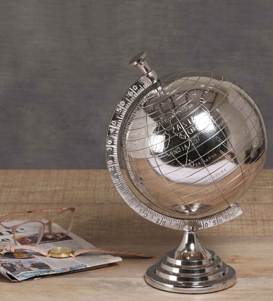A globe is a must have decor for your home. Replace the plastic globe with this metal one and enrich the look of your showcase. This can also be used for educative purpose. We work towards bringing the quality products to aim at developing the cognitive acumen of the futuristic minds of our nation. Teach the younger generations about the size and scope of the world around them, or try to impart some of the power by placing it in a decorative way.Specifications:Finish: NickelMaterial : MetalDimensions in cms : (L x W x H) 29.5 x 29 x 36.1Sold as Single pieceCare instruction: Clean with dry cloth