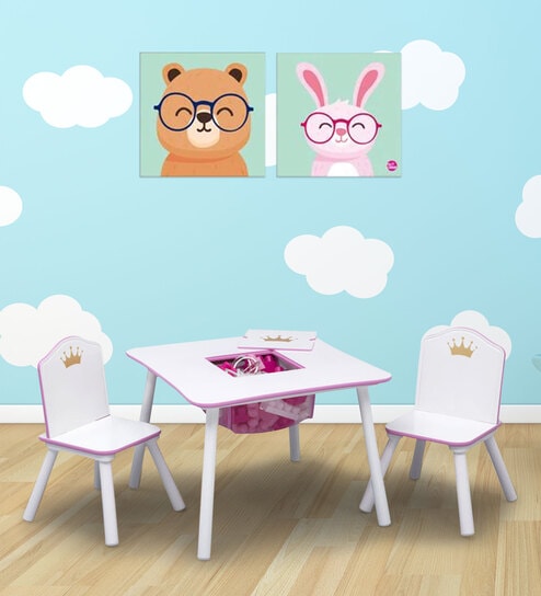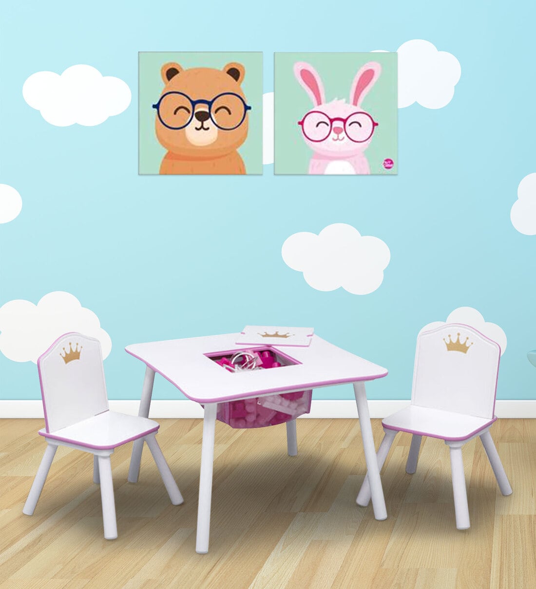 The Princess Crown Kids Chair Set and Table is fit for a fairytale. The set includes two chairs and a coordinating table with a storage cubby in the middle to keep art supplies or toys. The perfect place to hold court, tea parties, tackle art projects or eat, this durable wood chair set and table will encourage a fun environment for your little one to learn and play.
