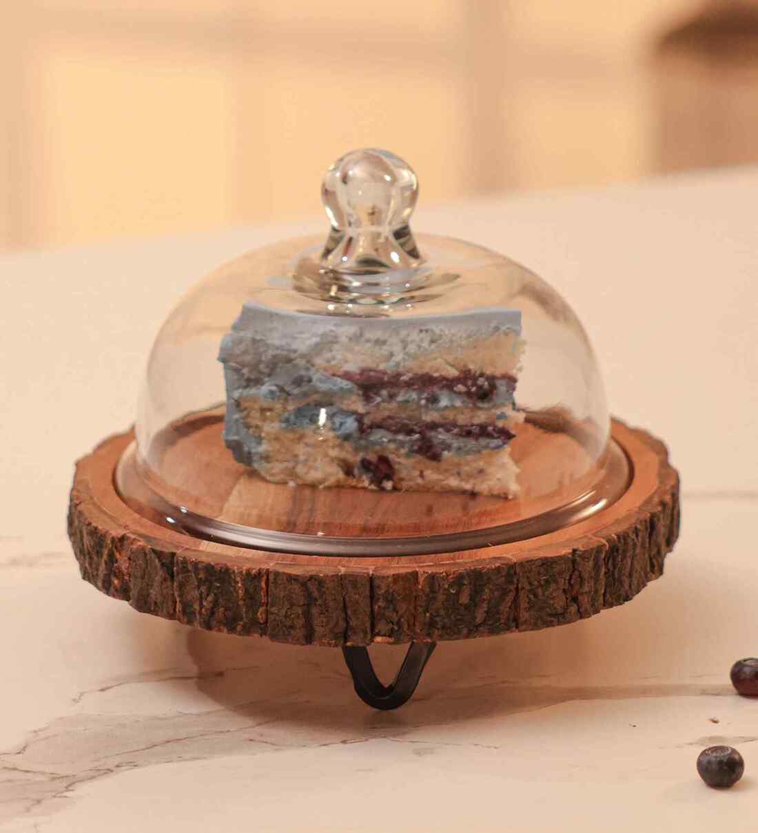 Each piece is handmade by skilled artisans from Moradabad, with a natural wood slice base that showcases the bark edge for an organic, earthy appeal. The hand-blown glass dome keeps your cookies, truffles, or mini bakes fresh while offering a clear view of your display. The unique grain and raw bark texture make every piece one of a kind.