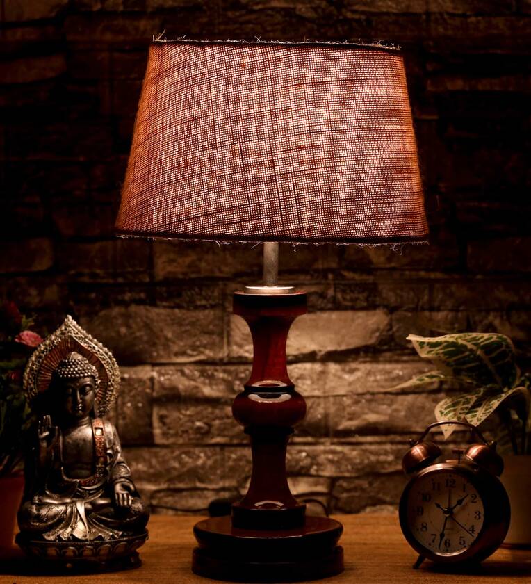 Salerno Brown Natural Fiber Shade Night Lamp With Wood Base