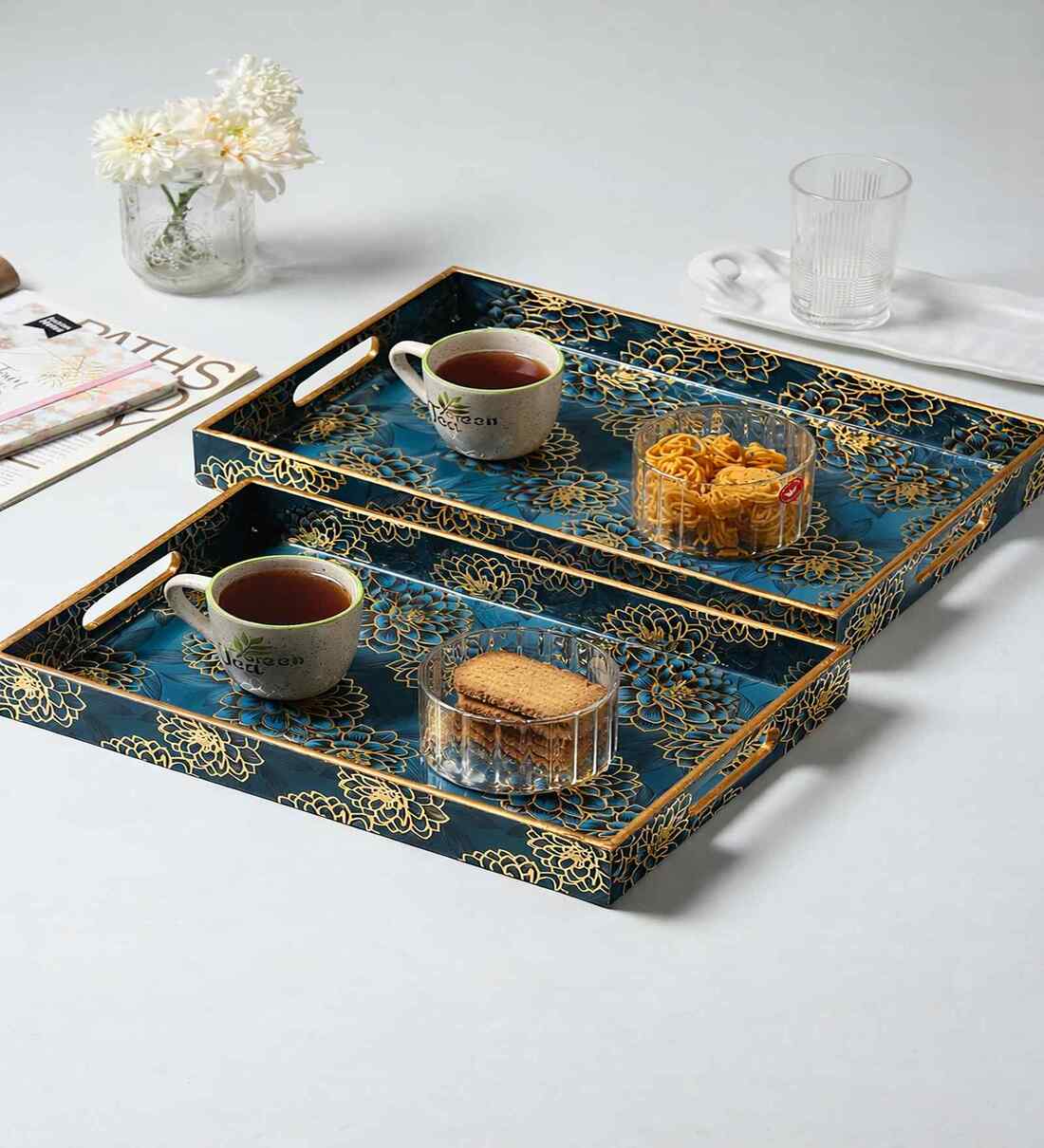 Sapphire Wreath blooms with soft floral patterns drifting across a deep sapphire surface, gently traced with golden touches that catch the light like quiet sparks. The design feels calm yet expressive, where layered petals create a sense of flow and harmony. Finished with a clear enamel coating, it offers a luxurious, high-gloss shine while enhancing durability and protection. Crafted as a tray set to hold cups, candles, or little treasures, it feels both peaceful and special turning everyday moments into something softly beautiful for kitchen and dining spaces.