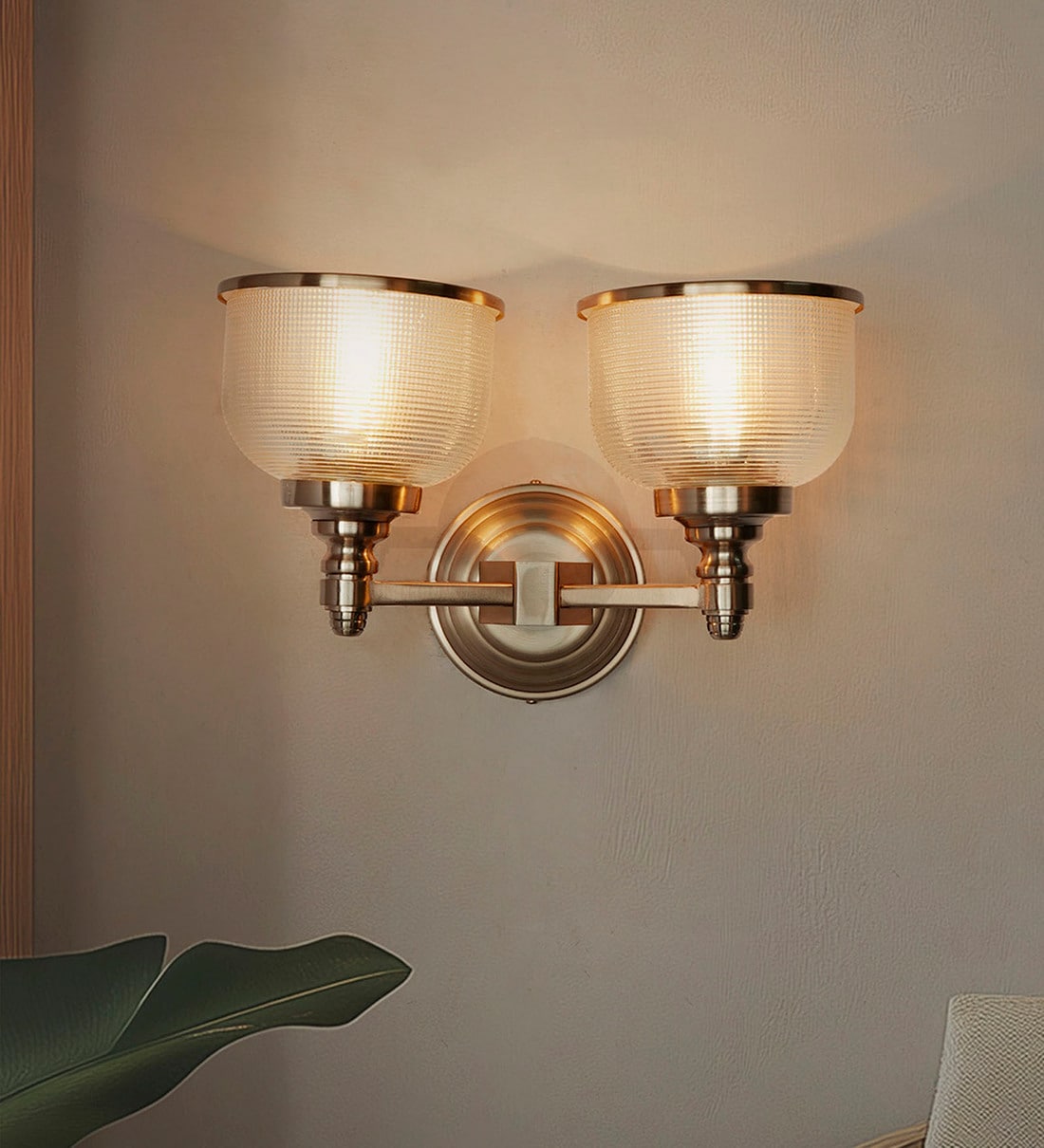 Satin Steel Double Wall Sconce with Rimmed Glass Shades