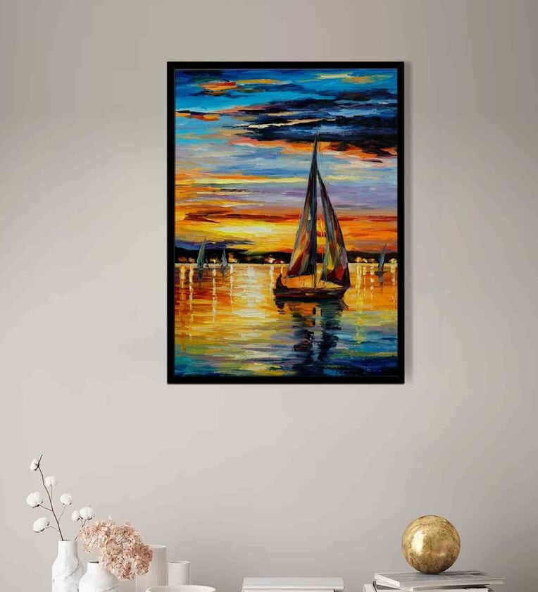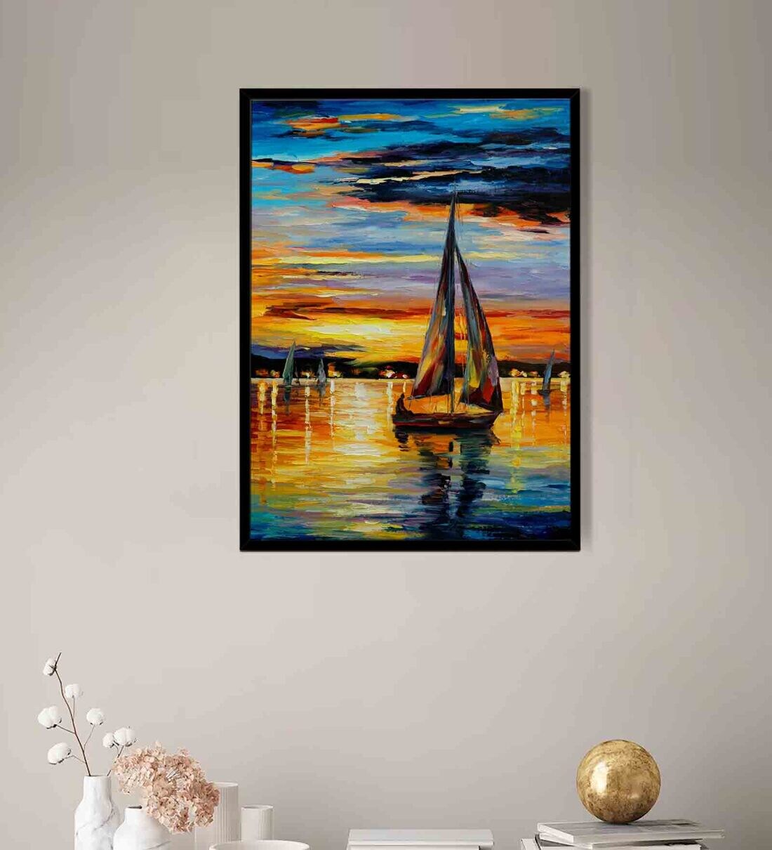 Seascape Sunrise Multicolour Synthetic Wood Framed Canvas Wall Painting