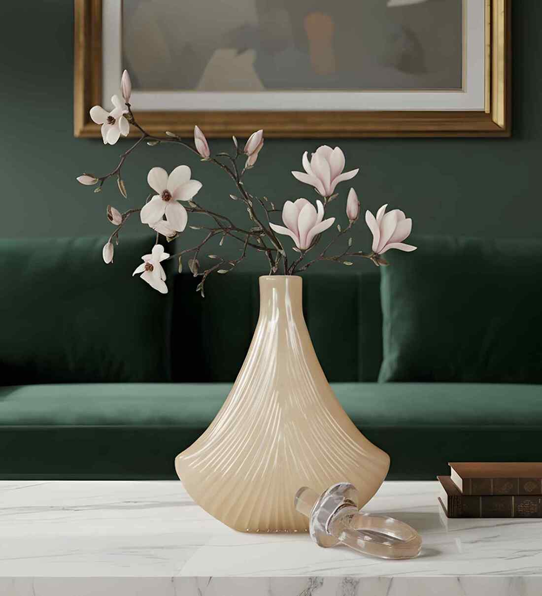 This decorative piece features an elegant, fan-shaped body with gentle, radiating ridges that resemble the delicate lines of a seashell or a pleated fabric. The glass is a soft, creamy beige hue, giving it a warm, vintage aesthetic. At the top, it has a sleek, narrow neck capped with a round, open-loop lid, made from clear glass, adding a modern touch to its classic form. Its design is both graceful and timeless, ideal for adding a refined touch to any interior space. Suggested Uses: 1. Decorative Vase: Remove the stopper and use it for dried or fresh floral arrangements. The wide base supports larger stems or fuller bouquets. Its color can warm up neutral interiors or complement autumnal palettes. 2. Display Jar: Keep the stopper on and use it purely as a decorative object on a shelf, console table, or credenza.