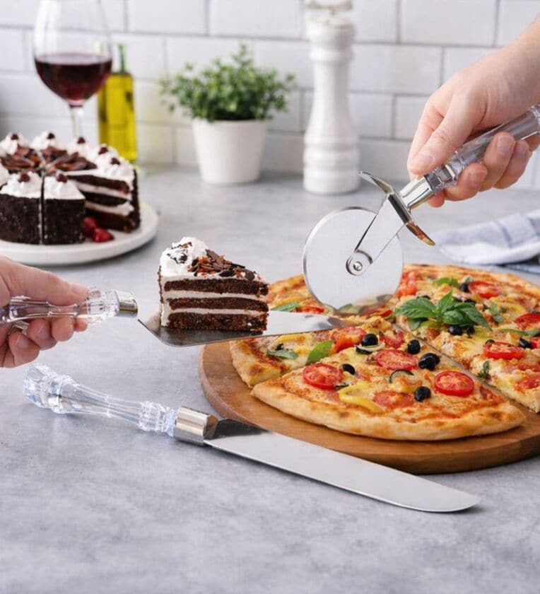 3-in-1 Stainless Steel Cake Cutting Knife Cake Server & Pizza Cutter Set offers versatile functionality in one convenient package. This multipurpose set includes a cake cutting knife cake server and pizza cutter providing everything you need for effortless slicing and serving of cakes pastries and pizzas.