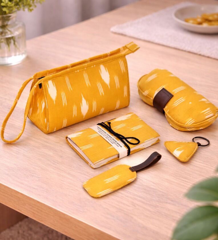 Bright, bold, and beautifully hand-stitched this desk companion set is crafted with traditional Kantha fabric featuring a lively yellow edge for that cheerful yet elegant touch.