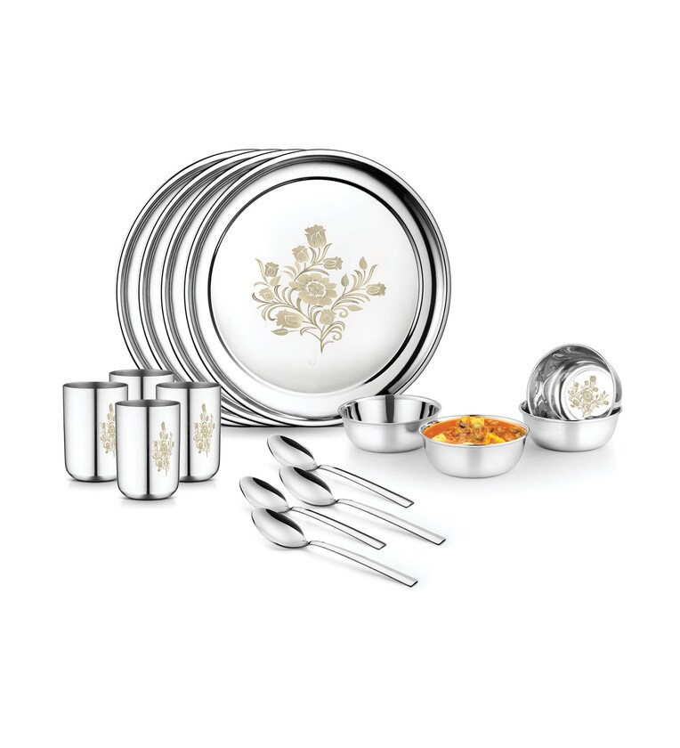 Featuring a set of 16 stainless steel Dinner Set including Full Plates,Half Plates,Curry Bowls Large,Glass and Desert Spoon, the Jensons Dinner set is ideal serving a scrumptious meal for people with ease. Featuring a highly attractive design motif, this lunch set will surely impress your lunch and dinner guests while providing a great canvas to showcase your delicious food. Apart from your own use, you can also give this lunch set to your loved ones as a perfect gifting option on special occasions or festivals. Made from thicker gauge stainless steel, the 16-piece Jensons Dinner set is highly durable and can withstand the rigours of daily use with ease. Its strong and sturdy construction makes this set an ideal solution for both special occasions as well as everyday meals. Furthermore, all plates, spoons and bowls in this set are rust-proof and hygienic, preventing contamination of your food. The individual pieces in this Dinner set can be nested together and this makes them ideal to stack up and store away when not being used, saving valuable kitchen space. Thanks to its sturdy construction, you can easily clean this Dinner set with a simple detergent solution and retain its shiny looks for a long time.A one stop-shop for home decor and furniture, Pepperfry sells a home product every 30 seconds.