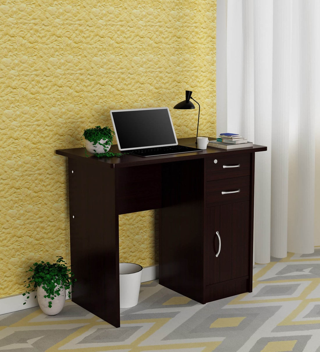 The wenge colored engineered wood study table exudes natural wood grain texture, making it a moody dark and solid addition to your home office or study