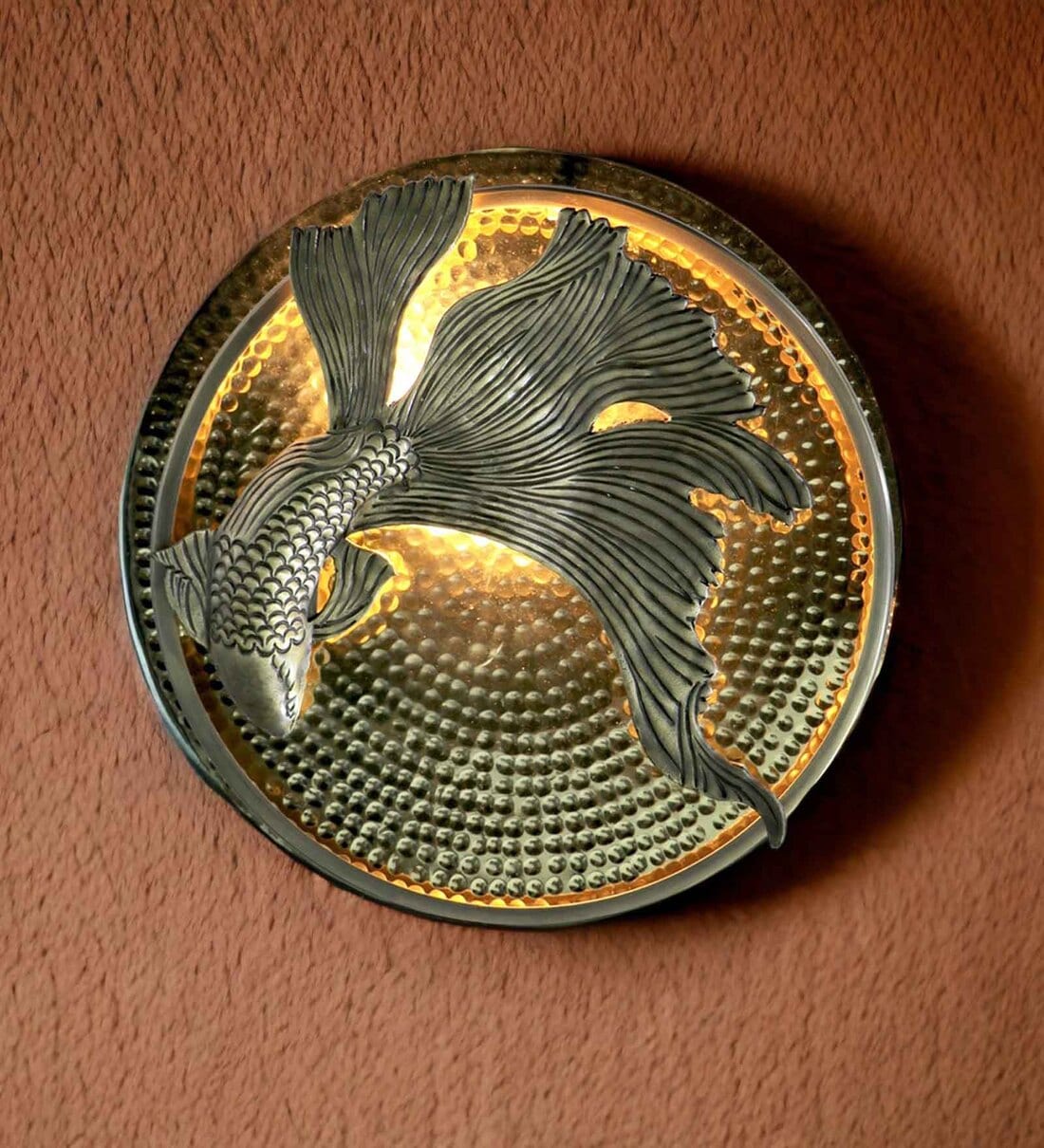 Product Description- The "Sirena Wall Lamp" is a stunning embodiment of aquatic elegance and masterful craftsmanship. Featuring a glossy brass finish plate with meticulously handcrafted hammered round designs, this wall lamp pays homage to the tranquility of the deep sea. At its pinnacle rests a beautifully designed fish, gracefully poised above the bulb, creating an enchanting underwater scene.