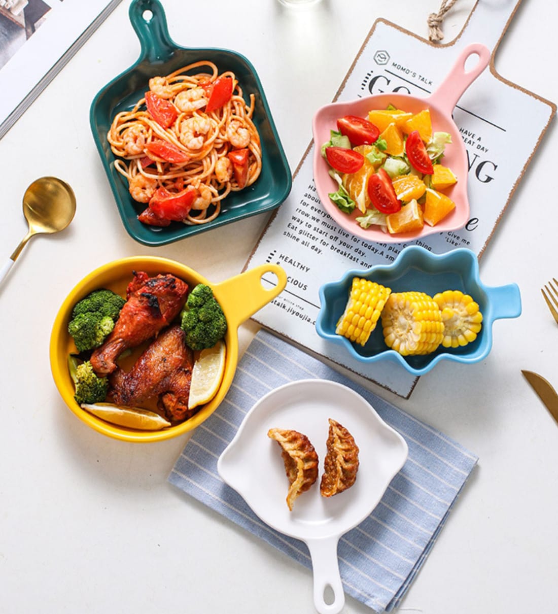 Skillet shaped ceramic baking tray provided with a handle making it easy to pick up and pass around. Microwave friendly and available in 6 colour variants, the trays are a wise choice to add to one's modern kitchenware set. The baking plate can also be used as a snack plate or a salad plate that can be used for serving directly on to the table. The plate with handle makes for an interesting serving plate for starters.