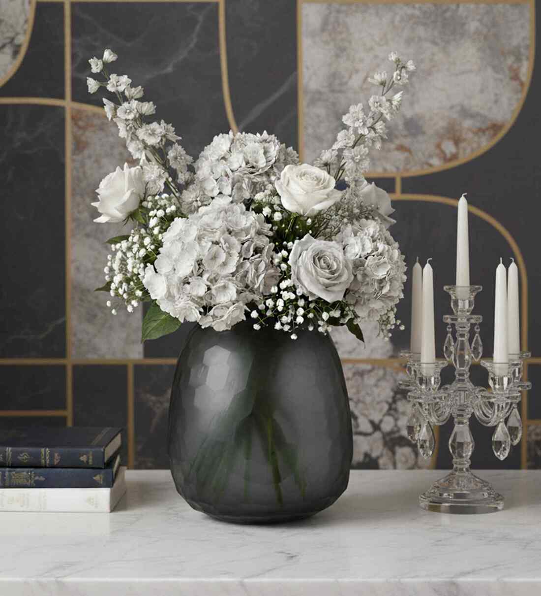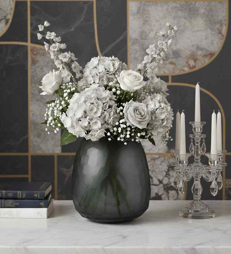 This luxury glass vase boasts a frosted charcoal finish and a geometric honeycomb texture, exuding understated elegance and modern sophistication perfect for an upscale contemporary d cor.