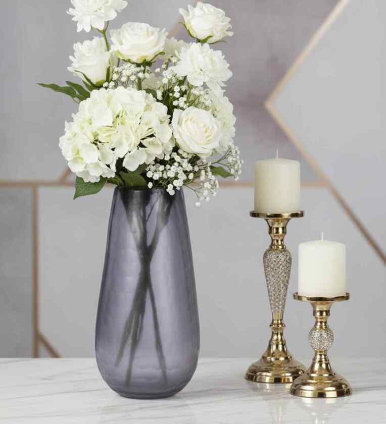 This glass vase features a sleek, elongated silhouette with a subtly tapered neck. Its surface showcases a unique, honeycomb-like texture, giving it a modern yet organic feel. The vertical line of the vase is elegant, giving it a refined finish, while the base is sturdy, ensuring stability.The soft gradient from translucent gray at the top to a deeper shade at the base adds depth and sophistication. The matte finish on the textured areas contrasts beautifully with the smooth, glossy edges, making it a versatile piece that complements minimalist, contemporary, or industrial interior.