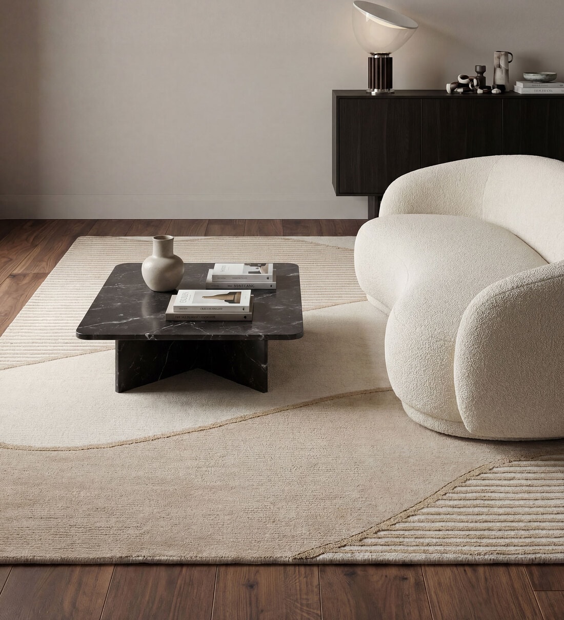 Curved liner geometric pattern adds gentle movement and visual interest to interiors. The soft surface feels inviting underfoot, making it ideal for smaller spaces, bedrooms, or seating corners. Its refined design provides a subtle focal point without overpowering d cor, complementing both modern and casual layouts.