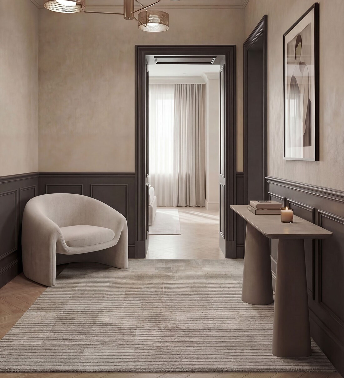 This textured striped rug uses white and sand tones to create depth without heavy contrast. The surface detail adds interest while keeping the look neutral.