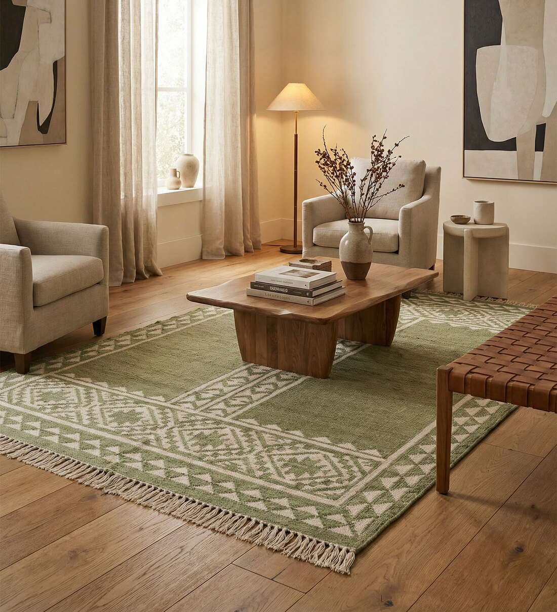 This Nebula collection rug showcases a tribal geometric pattern in treetop and white tones. Made from 100% wool, it delivers a calm, natural look with dependable construction.