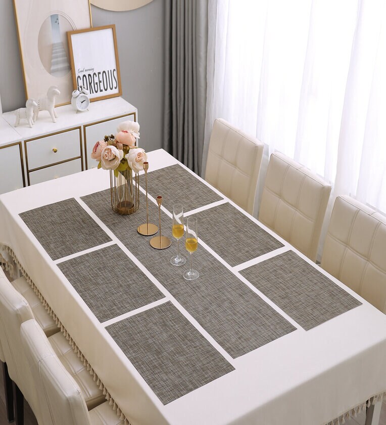 Set of 6 PVC dining table mats with runner 135cm by HOKIPO.Quality Material - This set of 6 dining table mats with runner are made using blend of 70% PVC and 30% Polyester.Easy to Clean - Simply wash this placemats runner set with tap water or sponge wipe and they will be clean.Size - This dining table mat measures 30x45 cm and table runner measures 30x135 cm in size.Package Contents - 6 Placemats & 1 Dining Table Runner.