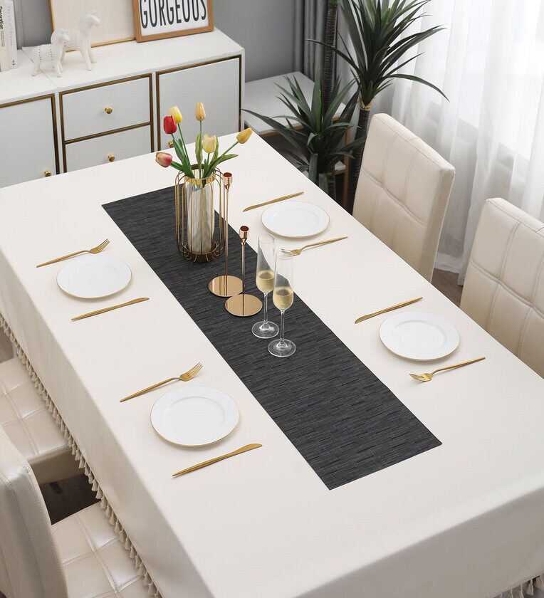30x135 cm dining table runner. Can also be used as centre table runner or side table runnerQuality Material - This dining table runner is made using blend of 70% PVC and 30% Polyester.Easy to Clean - Simply wash this center table runner with tap water or sponge wipe and it will be clean.Size - This dinner table runner measures 30x135 cm in size.Package Contents - 1 table runner for dining table / centre Table.