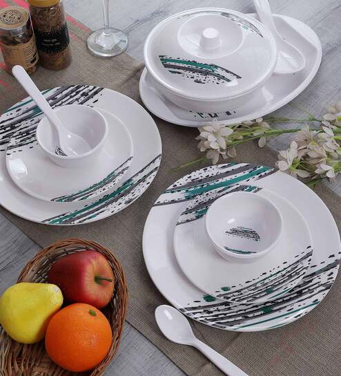 Set of 40- 6 Full Plates, 6 Quarter plates, 12 Dinner Bowls, 3 Serving Bowls, 3 Lids; 1 Rice Plate, 6 Spoons and 3 Serving Spoons.