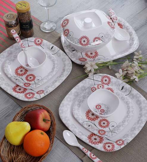 Square Floral 40 Pcs White & Red Melamine Dinnerware Set