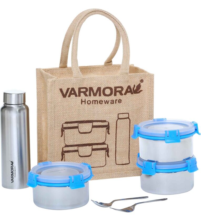 Varmora SS Cromo | Stainless Steel Lunch Box Set With bag | 3 Round Containers (520 ml each) & Water Bottle (500ml) | Airtight & Leak-Proof | BPA-Free & 100% Food Grade-Blue